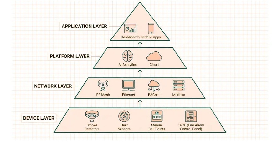 Η σύγχρονη ενσωμάτωση πυρασφάλειας έξυπνων κτιρίων ακολουθεί μια αρχιτεκτονική τεσσάρων επιπέδων που επιτρέπει την απρόσκοπτη επικοινωνία και την έξυπνη λήψη αποφάσεων: